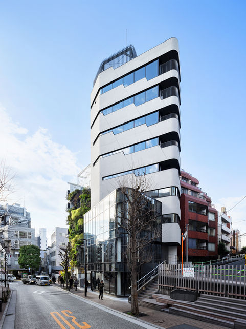The residential/commercial mixed-use building stands on a highly visible corner lot coming from Roppongi Hills to Azabujuban. The two uses are identified as one being made of concrete and the other made of glass, each with its own entry devised from the site cliff. In a dense urban neighborhood, window size preferences often differ depending on the floor you live - lower floors need greater visual privacy while in higher floors, a desire for large windows predominates to maximize the view. The project attempts to provide a solution with the "Variable Aperture" concept, where the horizontal "ribbon windows" become gradually longer and taller in higher floors, culminating in a spectacular panoramic view at the top floor unit.