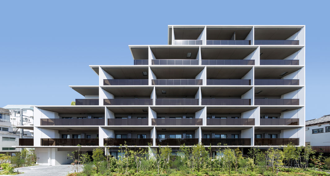 This 55-unit residential building sits in Bunkyo Otsuka, an area known as home of renowned higher education and medical institutions, catering to families seeking a spacious living accomodation in the heart of Tokyo. While typical reinforced-concrete structures in Japan tend to get disproportionately large beams and columns resulting in heavy-looking facades, we challenged that by inventively detailing the facade elements - thin balcony slabs and alternating vertical dividers are all 120mm in thickness, giving lightness and motion which set up an interplay of light and shadow. The result is a uniquely elegant facade taking advantage of the building's wide structural bays of 9.5m maximum.