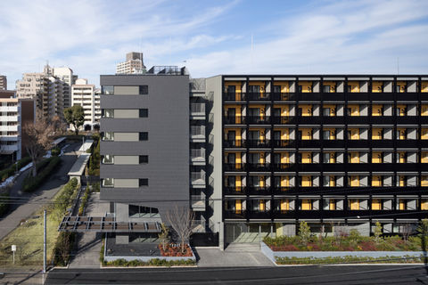 Hyakunincho is better known today for its bustling commercial and night life district, than a place for experiment and research. An unlikely past emerges as you look into its history, when this was once Tokyo's hub for public and private research institutions. The design of this residential complex is informed by the repetitive bays and solid materials which invoke memories of old research labs built with steel and brick that existed here. All four exterior-facing facades have a layer of extruded C-section frames, providing a sense of depth to the facade while making individual dwelling units feel more protected and independent. Throughout the interior public area, materials and furniture are selected under the same concept, and artworks by three artists enrich the spaces like a series of art galleries.