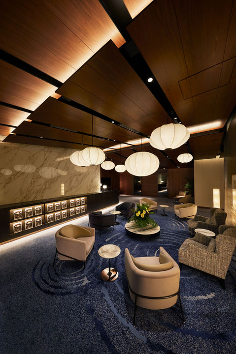The Club is the first satellite facility in its 90+ year history, dating back to the 1920s when the first American Club was established in Tokyo. Given the fact that the facility is for select membership and its size being considerably smaller than the main facility in Azabudai, we envisioned the Nihonbashi facility as a large "home" for the TAC family, where members would desire to frequently "return", rather than "visit". The facility consists of a fitness center, a bar/restaurant area, and a VIP room, all of which are covered under a single gently-sloped "roof". The consistent materiality and detailing of the roof-like ceiling is the most important design element connecting the separate areas of the Club both visually and emotionally. American black walnut, basalt stone, brass and custom wool carpet work in harmony to create spaces that represent American richness and Japanese sense of craft.